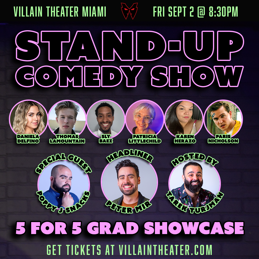 Meet the newest stars of Miami comedy! After 5 weeks, they're ready to perform their 5-minute sets for the very first time. Support live, local comedy and check out these new comedians! Special guest Poppy J Snacks. Hosted by Tarek Turjman.