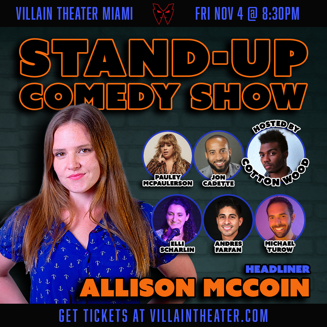 Allison McCoin is a comedian based in Miami. She has been performing standup for the last two years to distract herself from the world crumbling around her. Originally from Michigan, Allison brings a unique blend of Midwest sensibilities, sarcasm, and a hint of nihilism to her sets. You can also find Allison performing with her improv with her team at Villain Theater when she’s not doing standup.