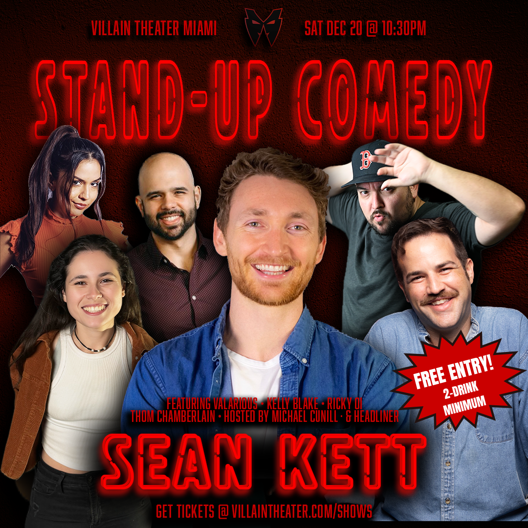 Villain Theater hosts stand-up comedy shows featuring the best hosts and local comedic talent in Miami every Saturday night at 10:30pm. This week’s line-up includes Valarious, Kelly Blake, Ricky Oi, Thom Chamberlain, and headliner Sean Kett. Hosted by Michael Cunill.